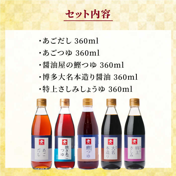 【全6回定期便】 上久 ジョーキュウ 新 博多 美味工房 5本セット 【 あごだし / あごつゆ / 鰹つゆ / 博多大名本造り醤油 / 特上さしみしょうゆ 】 糸島市 / 株式会社ジョーキュウ [AEA025] 九州 醤油 九州醤油 甘い しょうゆ あごだし 出汁 つゆ 鰹つゆ さしみ