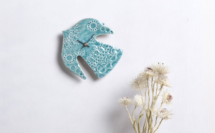 - 【美濃焼】 happy bird clock ターコイズ 時計 とけい 壁掛け 掛け時計 インテリア タイル レース 陶磁器 焼き物 雑貨 おしゃれ インテリア 雑貨 おしゃれ 多治見市 / 杉浦製陶 [TAO039]