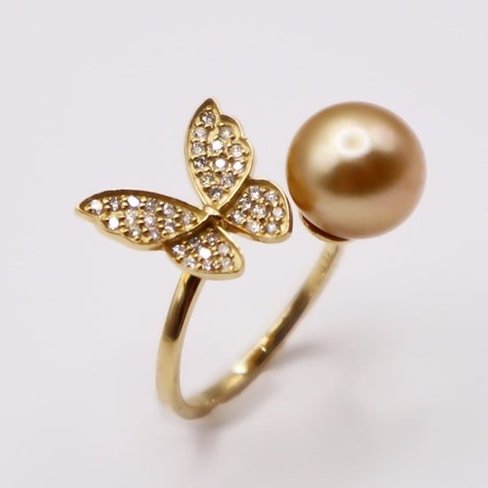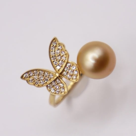 1960 K18 南洋ナチュラルゴールデン真珠9.0㎜up ダイヤモンド0.22ct リング