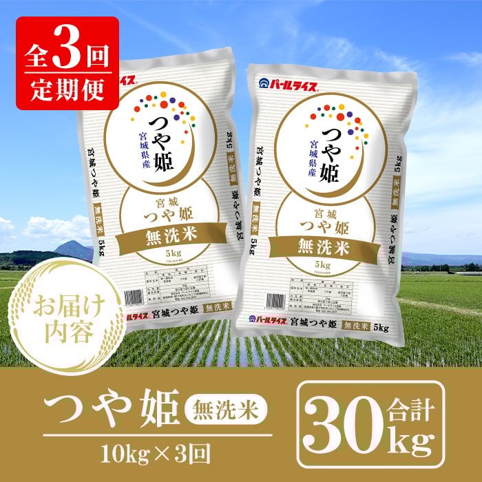 - <3ヶ月定期便>宮城県産 つや姫 無洗米 合計30kg (10kg×3回) お米 おこめ 米 コメ 白米 ご飯 ごはん おにぎり お弁当 ブランド米 宮城米 頒布会 エコ 時短【株式会社パールライス宮城】ta613