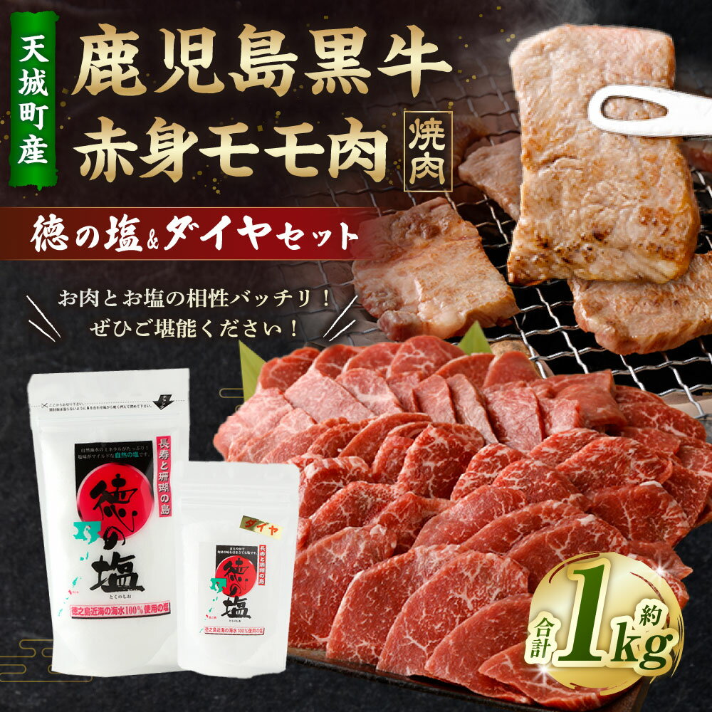 - 【ふるさと納税】【セット】 天城町産 鹿児島育ち 鹿児島 黒牛 赤身 モモ肉 焼肉用 1kg (500g×2パック) 徳の塩・ダイヤ セット 約230g 総計約1.23kg 黒毛和牛 赤身モモ肉 国産 焼き肉 BBQ バーベキュー お肉 牛肉 お塩 大粒の塩 塩 ソルト 海塩 鹿児島県 天城町 送料無料