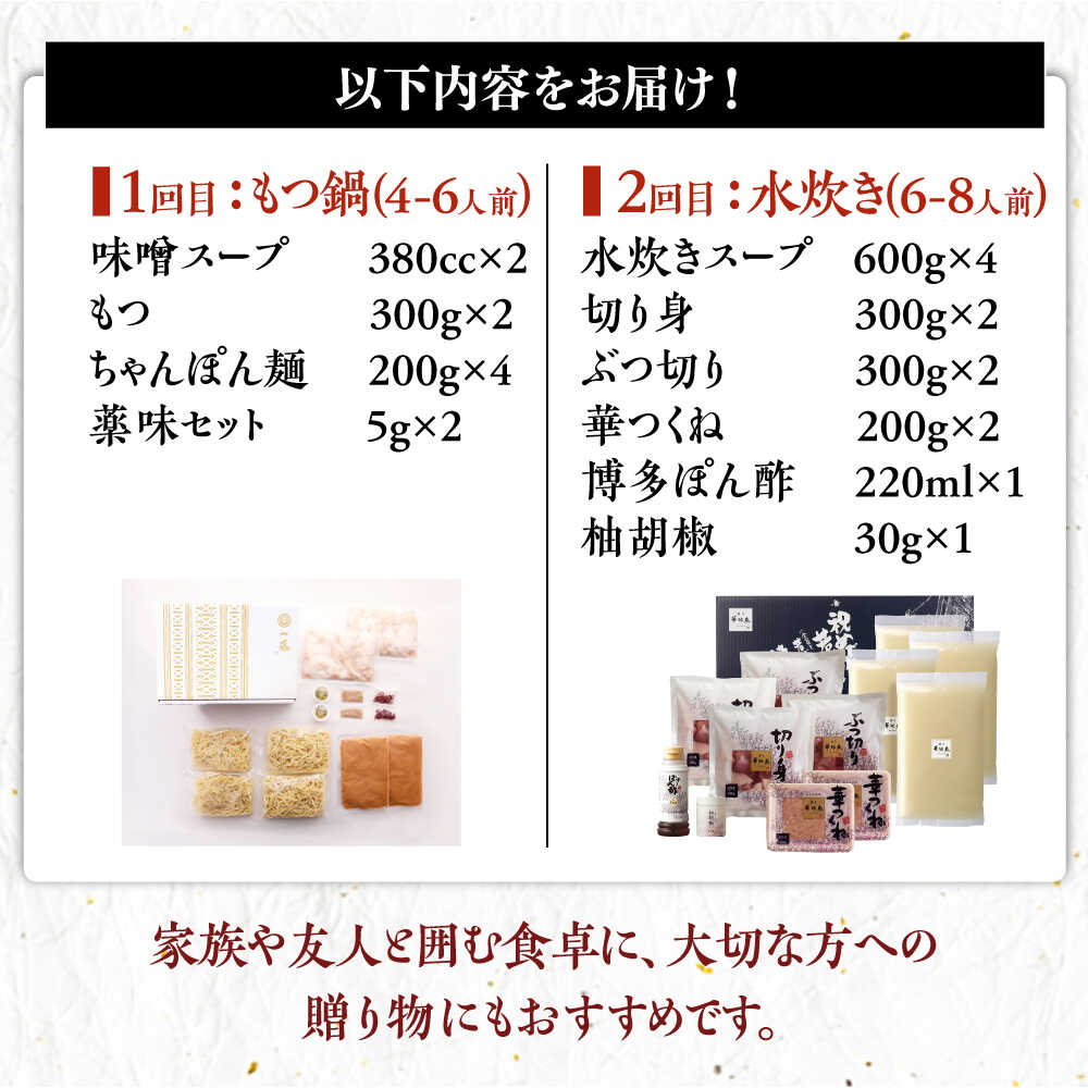 - 【ふるさと納税】【全2回定期便】 国産黒毛和牛のもつ鍋味噌味 4〜6人前 × 博多華味鳥 水炊き セット 6〜8人前 《築上町》 博多もつ鍋 水炊き 定期便 人気 おすすめ[ABZY019]