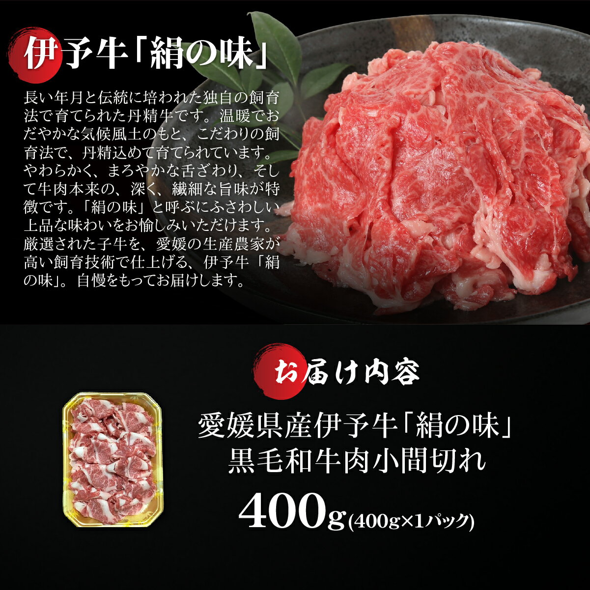 - 【ふるさと納税】【愛媛県共通返礼品】愛媛県産伊予牛「絹の味」黒毛和牛肉小間切れ400g | 肉 お肉 牛肉 和牛 冷凍 肉じゃが カレー 愛媛 IKTBF001