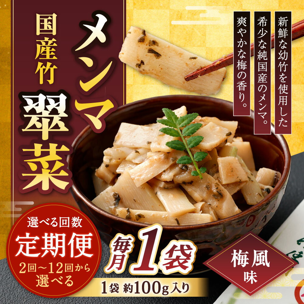 - 【ふるさと納税】【定期便】国産竹メンマ「翠菜」梅風味 選べる定期回数 2回 / 3回 / 4回 / 5回 / 6回 / 7回 / 8回 / 9回 / 10回 / 11回 / 12回 1回1袋約100g入り メンマ 合馬たけのこ 筍 タケノコ 麺麻 味付き うめ 梅味 国産 幼竹 希少 純国産 福岡県北九州市