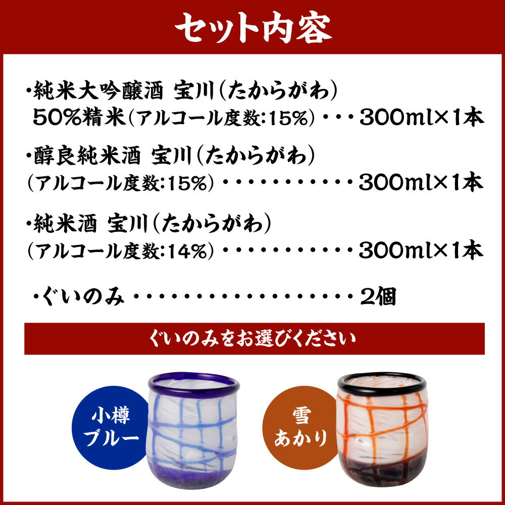 - 【ふるさと納税】小樽の地酒を小樽のグラスで飲み比べ。 宝川 3種と 【ぐいのみ】 2個セット 選べるカラー (小樽ブルー / 雪あかり) 宝川 純米大吟醸酒 日本酒 地酒 お酒 酒 さけ ぐい呑み 飲み物 飲料 ガラス 北海道 小樽市 常温
