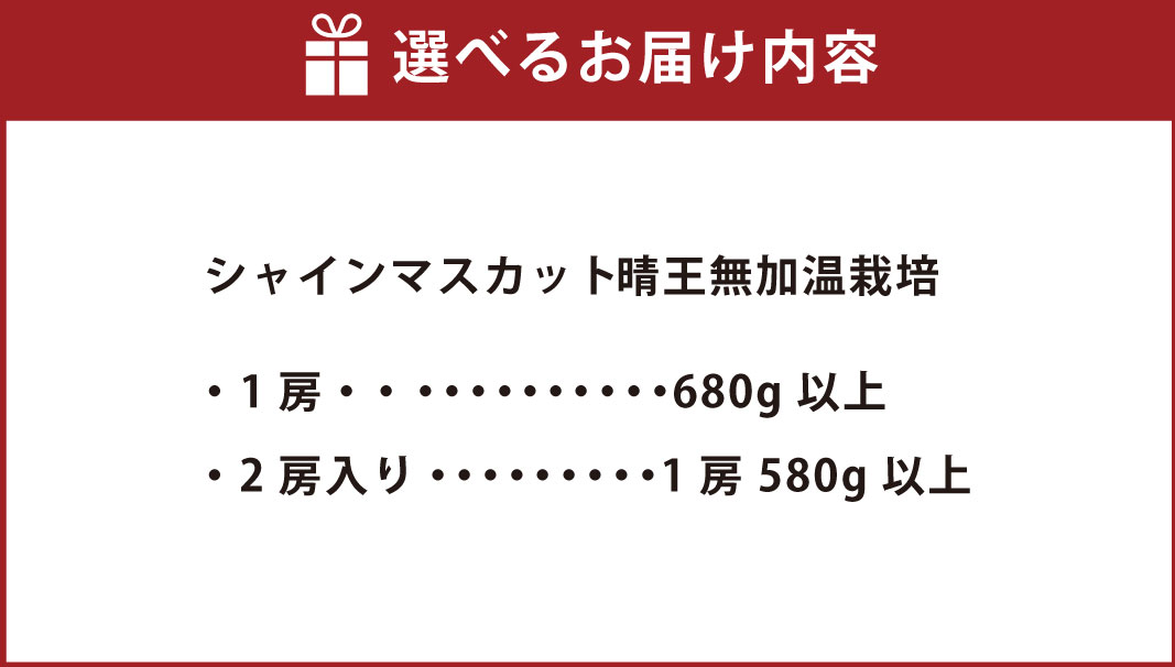 - 【ふるさと納税】シャインマスカット 晴王 1房~2房 選べる 容量 1房(680g以上) / 2房入り(1房 580g以上) 無加温栽培 マスカット ぶどう 岡山県産 国産 フルーツ 果物 ギフト くだもの 岡山のぶどう 【2026年9月上旬~10月下旬迄順次発送予定】
