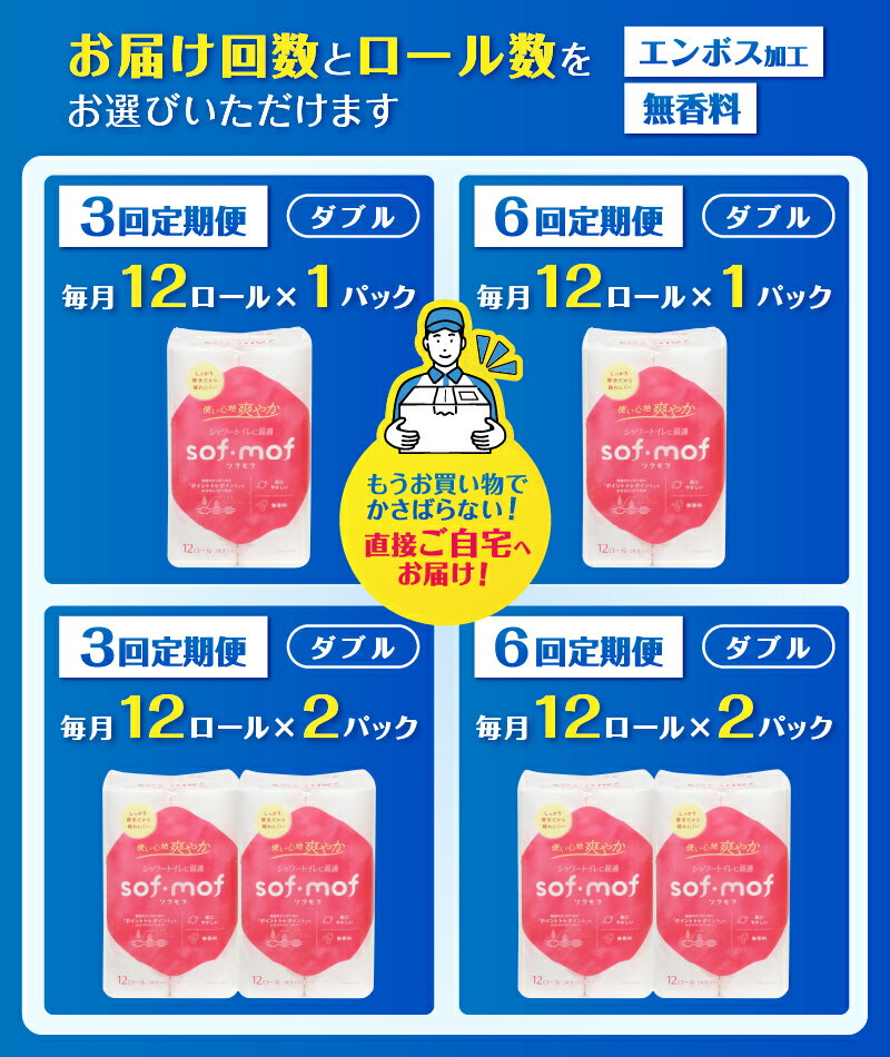 - 【ふるさと納税】 定期便 選べる回数・ロール数 ソフモフ トイレットペーパー ダブル シャワートイレ ダブル 3回/6回 1パック/2パック(1パック12R) 無香料 エンボス加工 パルプ100% バラ柄 厚手 生活用品 日用品 消耗品 防災 備蓄 毎月発送 富士市 [sf002-439-508]