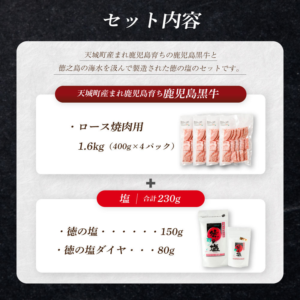- 【ふるさと納税】【セット】 天城町産 鹿児島育ち 鹿児島 黒牛 ロース 焼肉用 計1.6kg (400g×4パック) 徳の塩・ダイヤ セット 計約230g 総計約1.83kg 黒毛和牛 ロース肉 国産 焼き肉 BBQ バーベキュー お肉 牛肉 お塩 大粒の塩 塩 ソルト 海塩 鹿児島県 天城町 送料無料