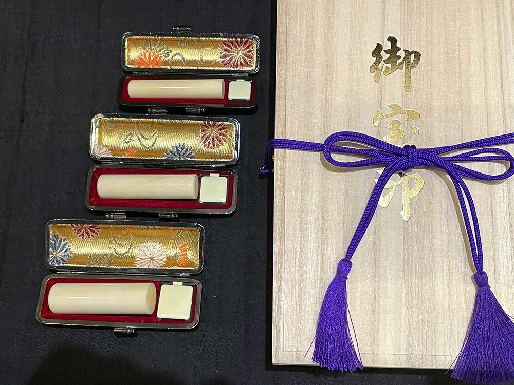 - 【ふるさと納税】一級彫刻士が彫る手彫り印鑑 3本セット 厳選された印材シーホース+松竹梅柄ケース付き カバ かばの歯 18mm丸・15mm丸・12mm丸 長さ60mm 実印 印鑑 はんこ ハンコ 判子 銀行印 認印 ご夫婦の実印 男性向け オーターメイド 三重県 桑名市 送料無料