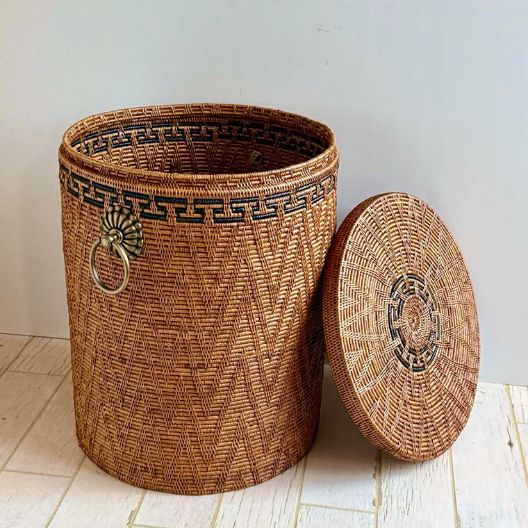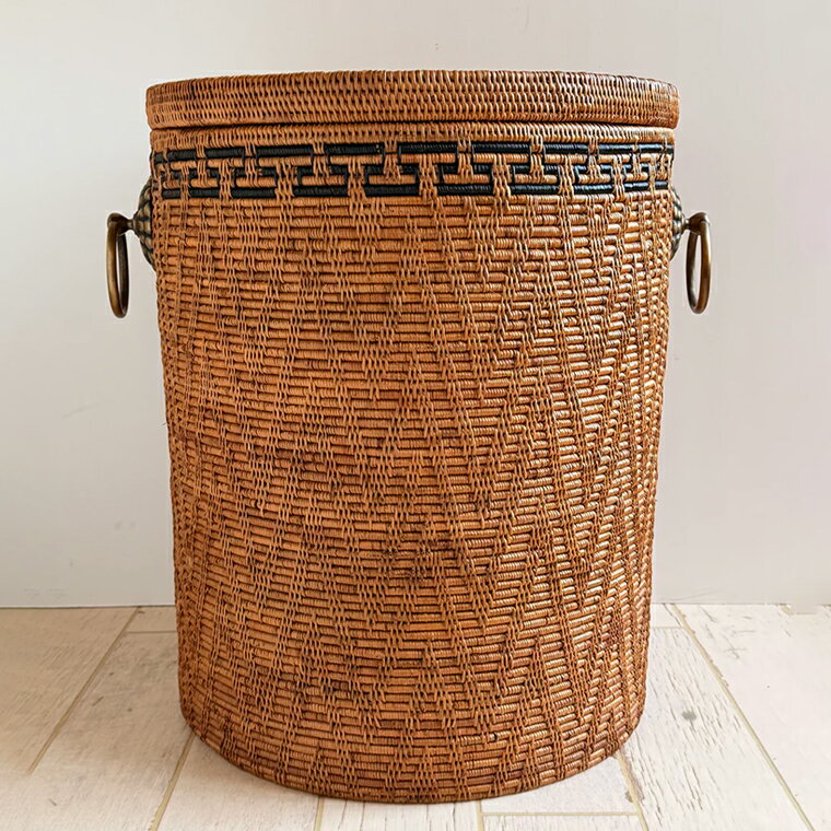 - 【ふるさと納税】アタ 真鍮 取っ手 蓋付き 円柱 バスケット 無地 φ42×H50 黒 模様 雑貨 収納 かご 大きい ケース バスケット 箱 物入れ ランドリーボックス インテリア 洗濯物 玄関 プール グッズ オリジナル 手作り おすすめ プレゼント ギフト 便利 数量限定 ATABRASS