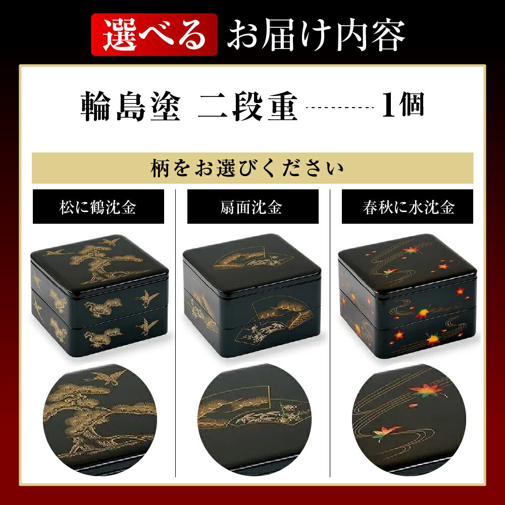 【ふるさと納税】輪島塗 二段重 ( 選べる柄 : 松に鶴沈金 / 扇面沈金 / 春秋に水沈金 ) | お重箱 漆器 輪島塗 漆塗り 伝統工芸 沈金 加飾 模様 金 木製 和食 食器 お正月 おせち オードブル ギフト プレゼント 贈り物 能登 石川県 輪島市