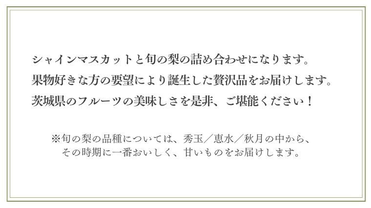- 茨城県産 「 シャインマスカット 3房 」 と「旬の 梨 」 詰め合わせ 約 5kg【茨城県共通返礼品/常陸太田市】 桧山果樹園 農家直送 桧山果樹園 農家直送 フルーツ 甘い 直送 茨城 限定 ギフト ぶどう シャインマスカット 旬 梨 秀玉 恵水 秋月 詰め合わせ 食べ比べ 果物 [DU013sa]