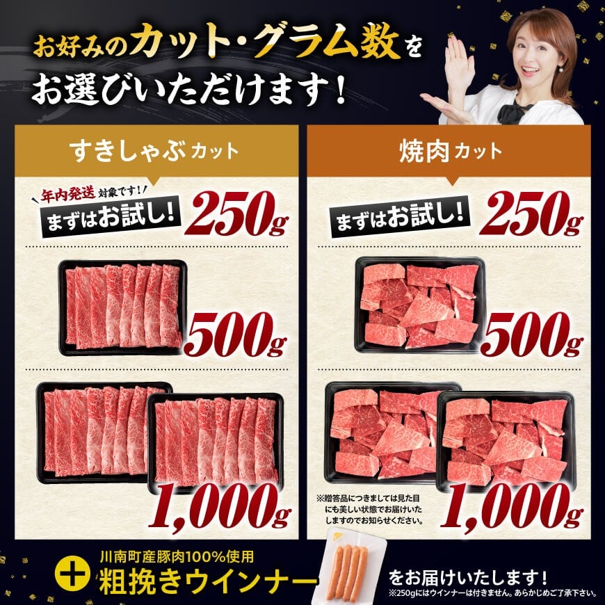 ※発送月・グラム・カットが選べる※ 生産者応援!宮崎牛 赤身(ウデorモモ)すきしゃぶor焼肉250g~1000g+粗挽きウインナー90g 【 牛肉 すき焼き スキヤキ しゃぶしゃぶ スライス 牛 肉 A4ランク 4等級 A5ランク 5等級 】