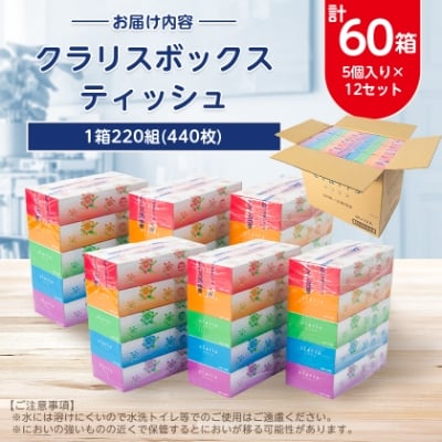 クラリスボックスティッシュ60箱(1箱220組(440枚))(5個入り×12セット)【1256759】