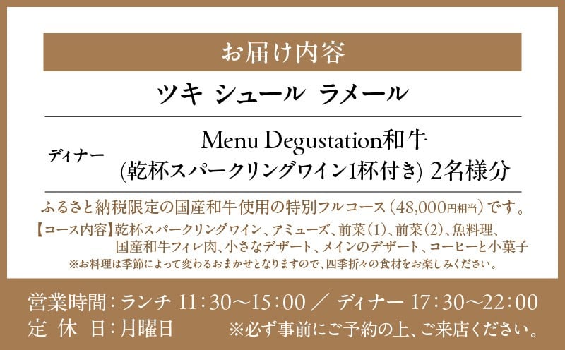 【ツキ シュール ラメール】《ディナー》Menu Degustation和牛<乾杯スパークリングワイン1杯付き> 2名様分(ぐるなびセレクション)