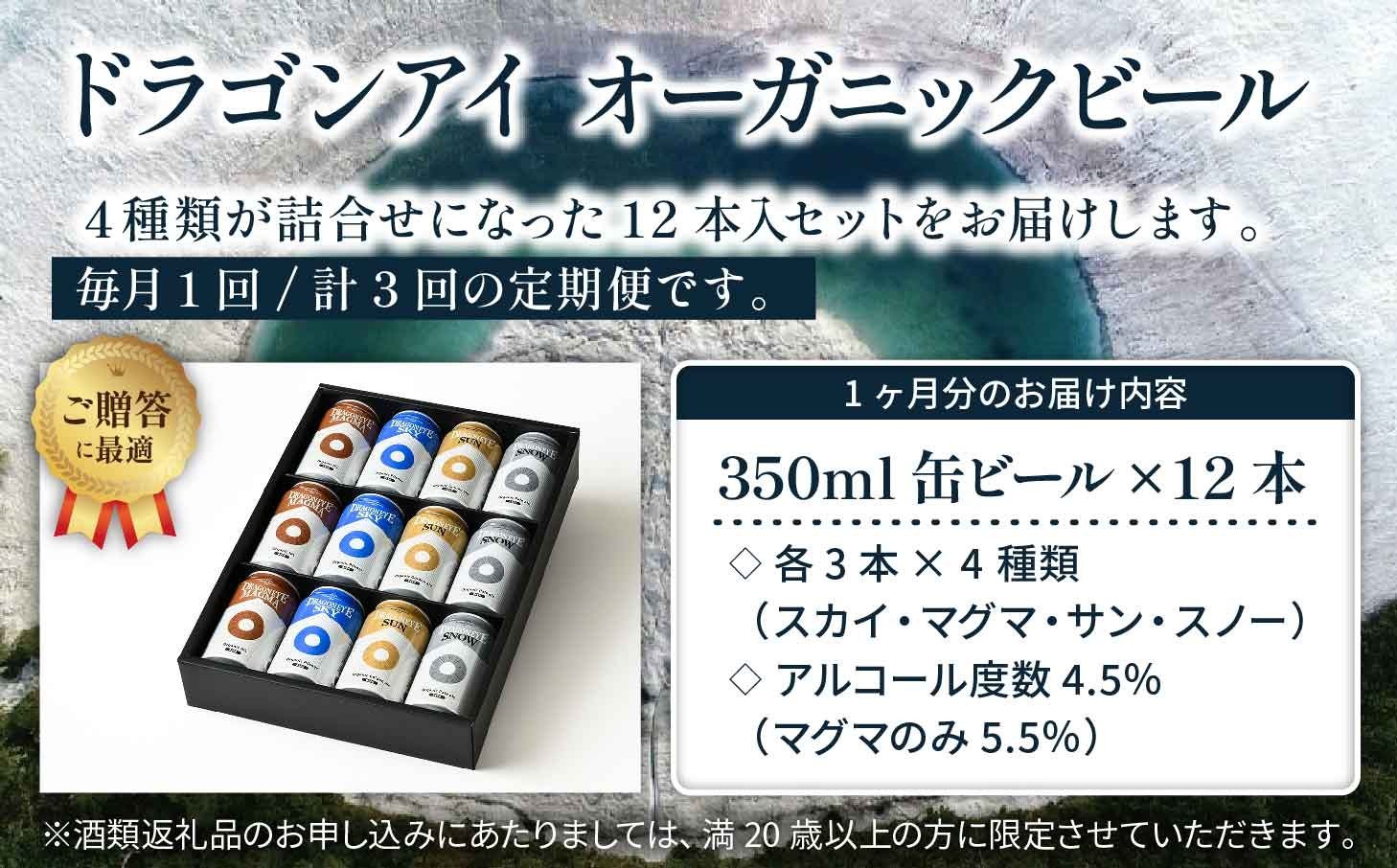- 【ご贈答用】 オーガニックビール ドラゴンアイ 「4種飲み比べ」 350ml缶×12本セット 3ヶ月定期便 暁ブルワリー/ クラフトビール 地ビール 飲み比べ 缶ビール 缶 ビール 晩酌 宅飲み 家飲み 贈答 プレゼント ギフト 贈り物 誕生日 詰合せ 酒 お酒 東北 岩手県 八幡平市 おすすめ オススメ