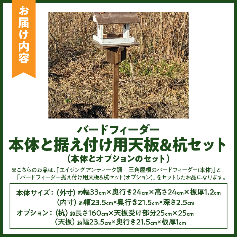 - エイジングアンティーク調 三角屋根のバードフィーダー 本体と据え付け用天板&杭のセット(本体とオプションのセット) [161P22] ユーズド感 アンティーク エイジング調 バードフィーダー 鳥のエサ台 天然木 ナチュラル おうち型 庭 据え置き 餌台 吊り下げ 安全 頑丈 国産 完成品 天然木製 防腐 防虫 木製品 手作り ガーデニング 雑貨 愛知県 小牧市 送料無料