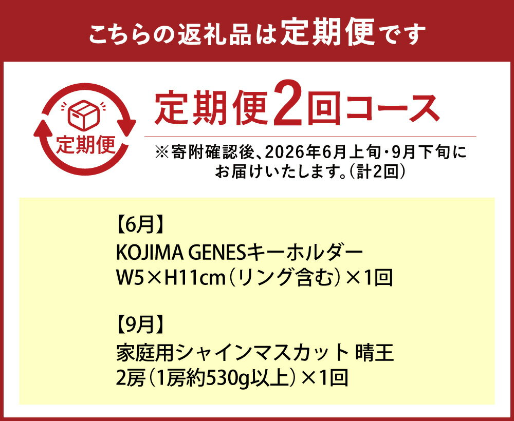 - 【ふるさと納税】【年2回定期便】KOJIMA GENESキーホルダー+家庭用シャインマスカット晴王 2房(1房約530g以上) セット ダブルニーステッチデザイン ジーンズ キーホルダー ぶどう 葡萄 フルーツ くだもの 果物 小物 雑貨 【2026年6月上旬~9月下旬まで発送予定】