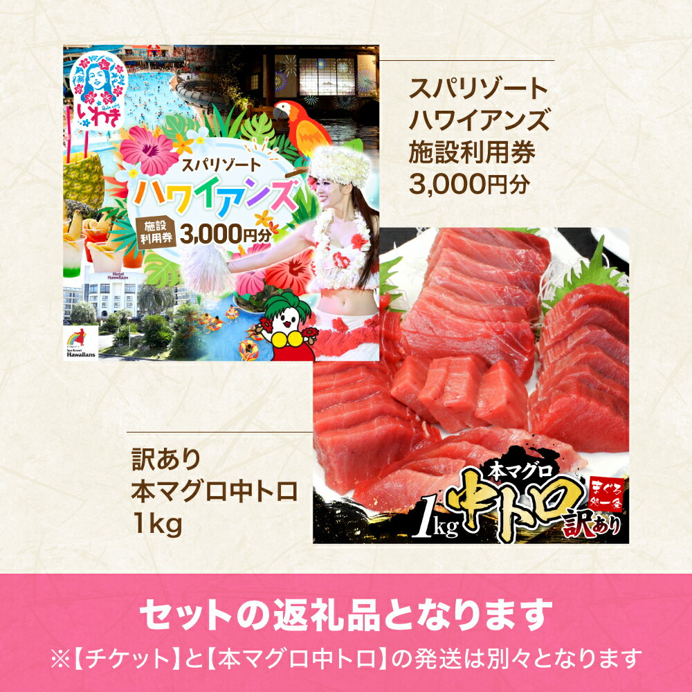 - 【ふるさと納税】スパリゾート ハワイアンズ 施設利用券3,000円分+本マグロ訳あり中トロ1kg | 利用チケット 入場券 ホテルハワイアンズ モノリスタワー ウイルポート フラダンス プール スパ 福島県 いわき市 マウナヴィレッジ ゴルフコース 株式会社東日本貿易 | ZZ023