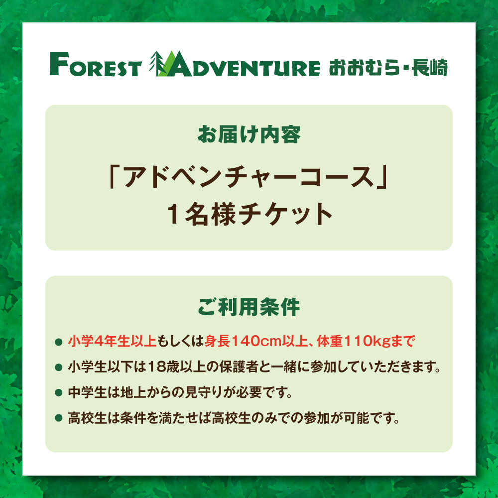 - 【ふるさと納税】ダイナミックでスリリングな樹上体験を! アドベンチャーコース チケット (1名様) / 観光 入園券 チケット 遊ぶ 体験 自然 アクティビティ アスレチック 大人 子ども 満喫 楽しむ キッズ 家族 友人 / 大村市 / フォレストアドベンチャー[ACCH004]