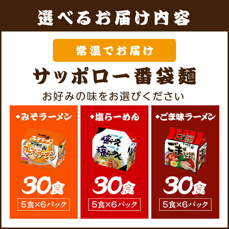 - 【ふるさと納税】\味が選べる!/サッポロ一番 ラーメン30食(5食×6パック) みそ 塩 ごま味 ふるさと納税 ラーメン サッポロ一番 醤油 ごまラーメン 味噌ラーメン 塩ラーメン 選べる 味 袋麺 インスタントラーメン 即席麺 非常食 保存食 備蓄 防災 時短 簡単