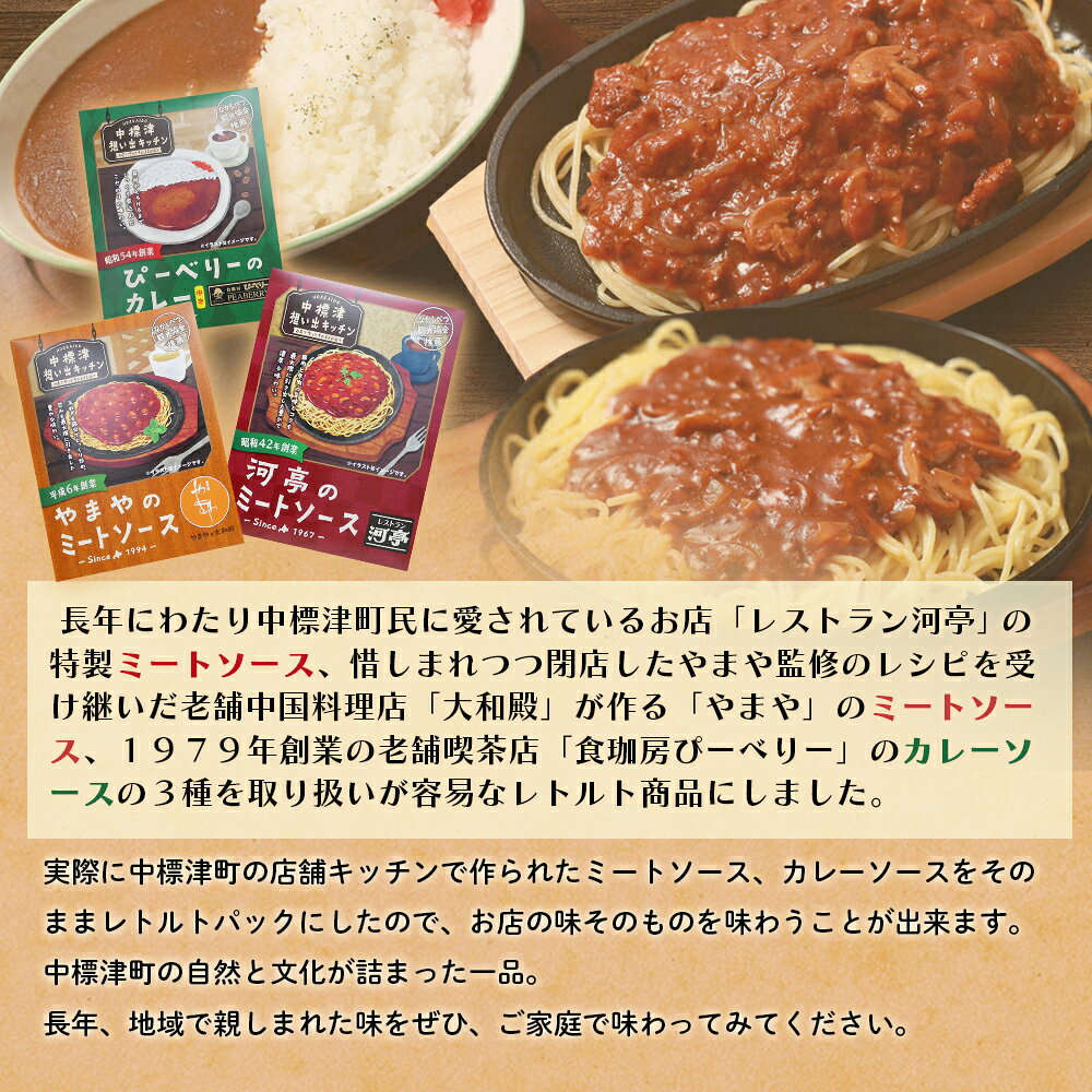 【ふるさと納税】中標津 想い出キッチン 「河亭のミートソース」「やまやのミートソース」「ぴーべりーのカレーソース」 3種詰め合わせ | ミート カレー ソース 150g×各1箱 計3箱 レトルト 時短 料理 店の味 北海道 中標津町 中標津【32023】