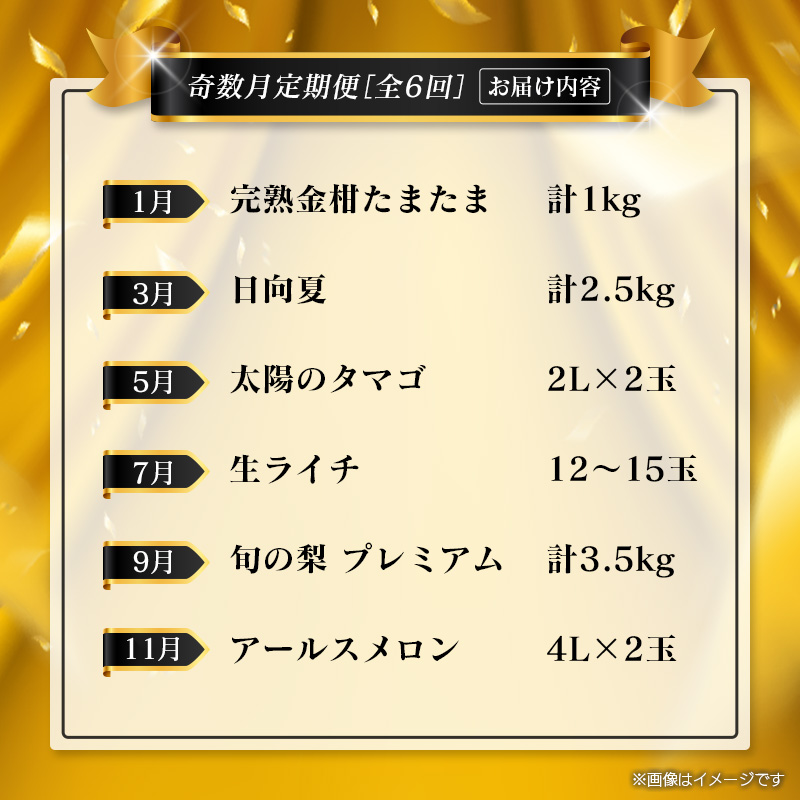 - <年末年始限定!!>厳選 フルーツ 奇数月隔月 定期便[全6回]隔月 お届け 宮崎 人気 おすすめ ランキング マンゴー ライチ メロン 梨 日向夏 金柑 数量限定 期間限定 2026年1月5日まで!【F157】
