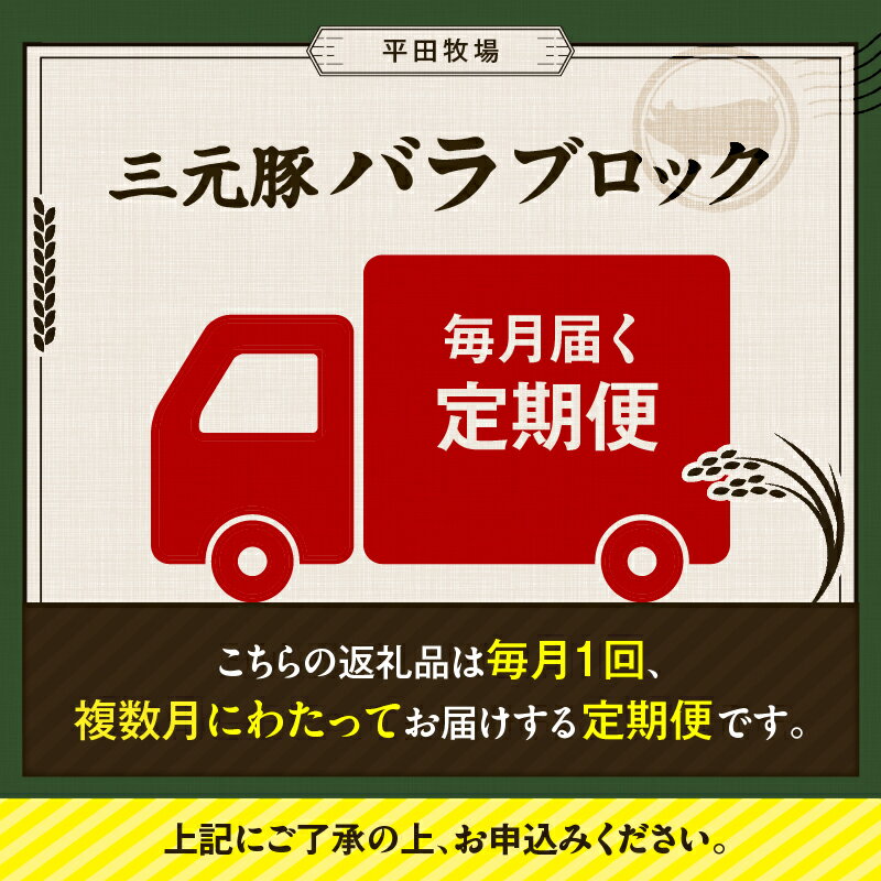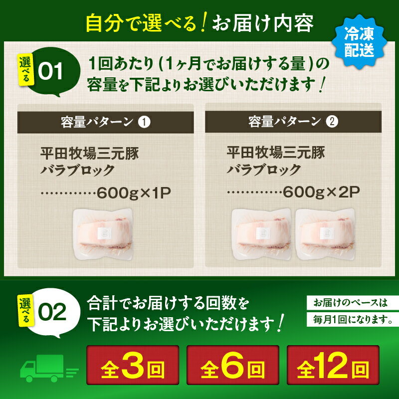 - 【ふるさと納税】<選べる容量と回数> 3回 ~ 12回 毎月 定期便 日本の米育ち平田牧場 三元豚バラブロック 600g or 1.2kg 肉 豚 豚肉 三元豚 バラ ブロック 塊 冷凍 便利 パック 定期 平田牧場 北海道 苫小牧市 おすすめ ランキング プレゼント ギフト