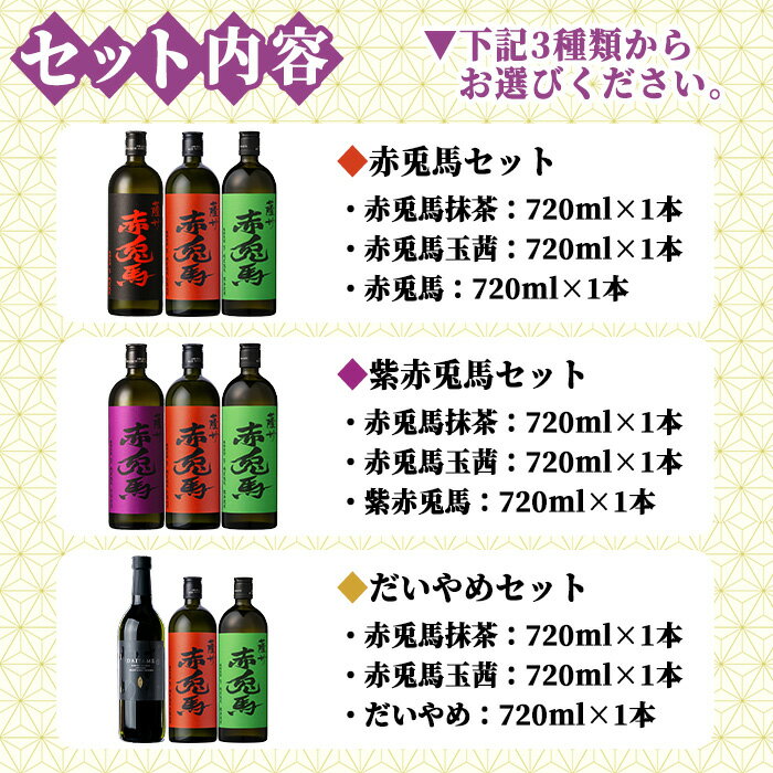 - 【ふるさと納税】《組み合わせ選べる》鹿児島本格芋焼酎「赤兎馬抹茶」「赤兎馬玉茜」飲み比べセット (720ml×各1本・合計3本) 鹿児島 鹿児島特産 酒 お酒 アルコール 焼酎 芋焼酎 せきとば 抹茶 玉茜 だいやめ 常温 常温配送 セット 飲み比べ 数量限定 【夢酒店】