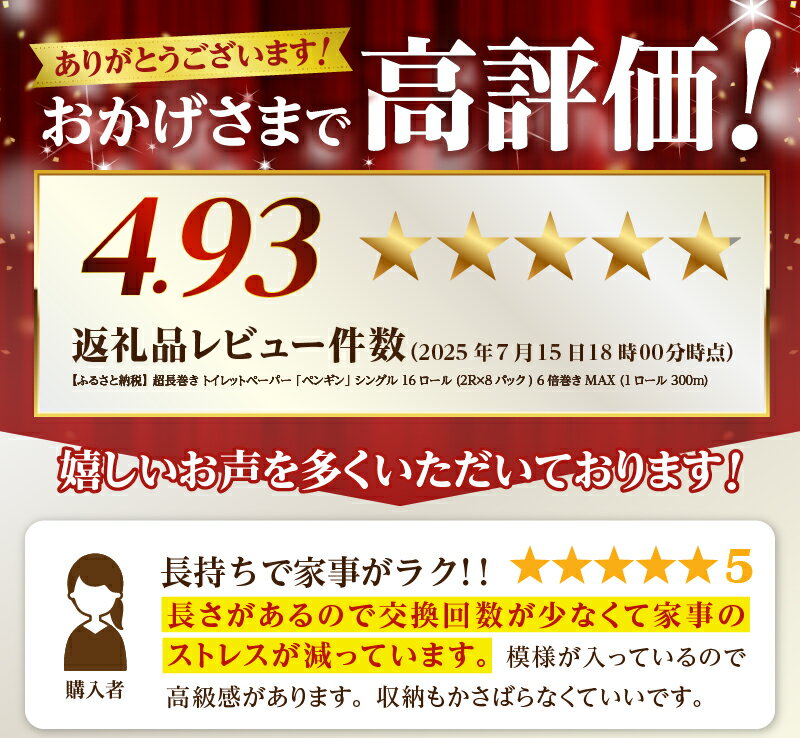 【ふるさと納税】 高評価★4.93 超長巻き トイレットペーパー 「ペンギン」 シングル 選べる16ロール/32ロール (2R×8P/16P) 6倍巻き MAX 96R/192R相当 パルプ100% 超ロング 芯なし 省スペース 長持ち 備蓄 防災 無香料 日用品 生活用品 富士市 [sf002-195] [sf002-550]
