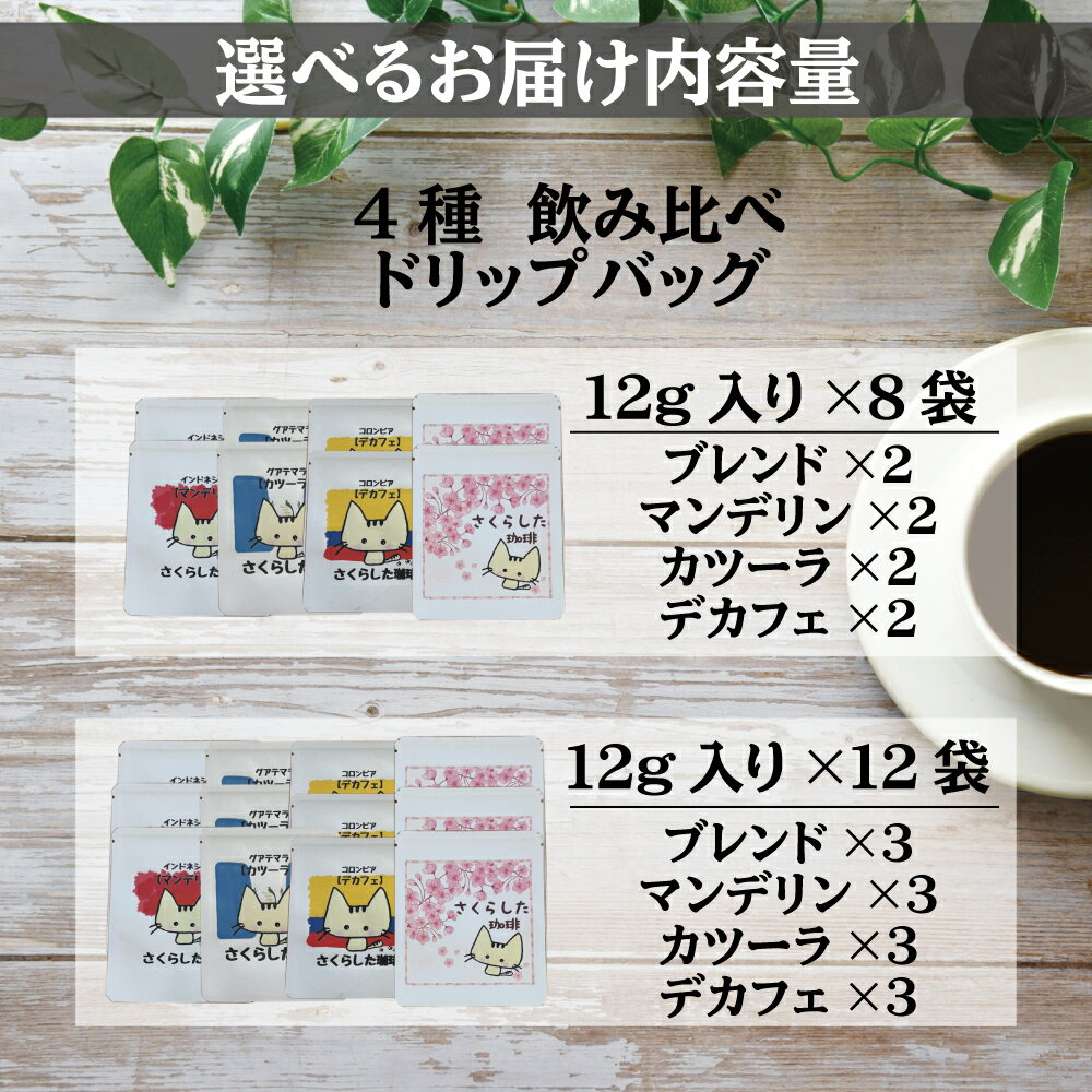 【ふるさと納税】スペシャリティコーヒー ドリップバッグ コーヒー 飲み比べ 4種セット(ブレンド・マンデリン・カツーラ・デカフェ) <選べる数量> | ドリップコーヒー アソート 珈琲 オフィス 贈答 ギフト プレゼント さくらした珈琲 12g ワンドリップ 送料無料 新地町