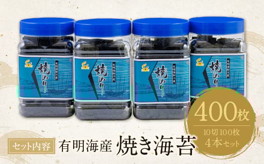 W26-38 有明海産 焼き海苔 ボトル4本 10切100枚×4本 計400枚 のり 海苔 焼海苔 小分け 有明産 焼きのり 国産 おにぎり お弁当 寿司 ごはんのお供 人気 海苔 海産物 乾物 おすすめ 海苔 ★レビューキャンペーン開催★