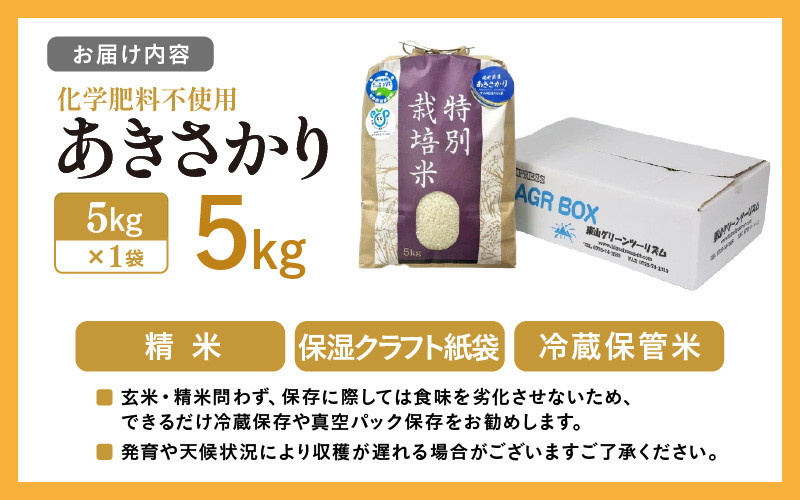 【令和7年産】 化学肥料不使用あきさかり 精米 5kg(5kg×1袋) / 白米 米 福井県あわら市産 美味しい 特別栽培米 減農薬 安心な米 旨味 甘み もっちり 冷蔵保管米 [aw010-a024]