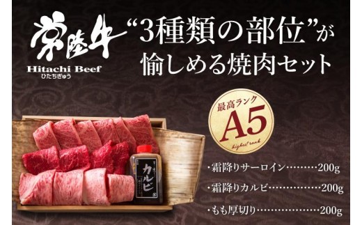 - 肉 常陸牛 A5 極上焼肉3品盛り合わせ 計600g 木箱入り 特製タレ付き 4万円 敬老の日 ギフト セット 食べ比べ サーロイン カルビ もも厚切り 焼肉 贈答 茨城県 水戸(DU-2)