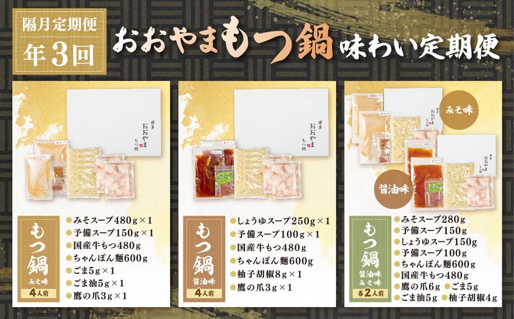 - 選べる!「おおやま」もつ鍋 味わい定期便【隔月定期便(年6回 / 3回発送)】 もつ鍋 醤油 しょうゆ みそ 味噌 おおやま モツ ホルモン 定期便 福岡 人気 国産 福智町 人気 おすすめ W08