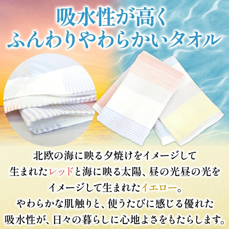 - 【ふるさと納税】ソリュース フェイスタオル イエロー / レッド 3枚 / 各6枚 泉州タオル 34cm × 85cm タオル ふんわり やわらかい 吸水性 綿100% 日本製 ふくろやタオル 日用品 大阪府 泉佐野市 送料無料