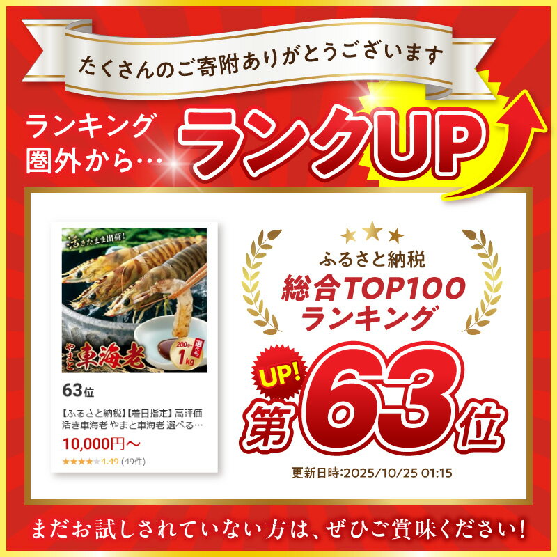 - 【ふるさと納税】【着日指定】 高評価 活き車海老 やまと車海老 選べる 内容量 200g 300g 500g 1kg 車海老 海老 海鮮 魚介類 新鮮 鮮度抜群 プリプリ 食感 甘味 魅力 自然に近い 養殖 踊り食い 塩焼き 天ぷら エビフライ エスニック料理 常温 お取り寄せ 熊本県 送料無料