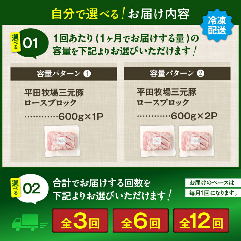 - 【ふるさと納税】<選べる容量と回数> 3回 ~ 12回 毎月 定期便 日本の米育ち平田牧場 三元豚ロースブロック 600g or 1.2kg 肉 豚 豚肉 三元豚 ロース ブロック 塊 冷凍 便利 パック 定期 平田牧場 北海道 苫小牧市 おすすめ ランキング プレゼント ギフト