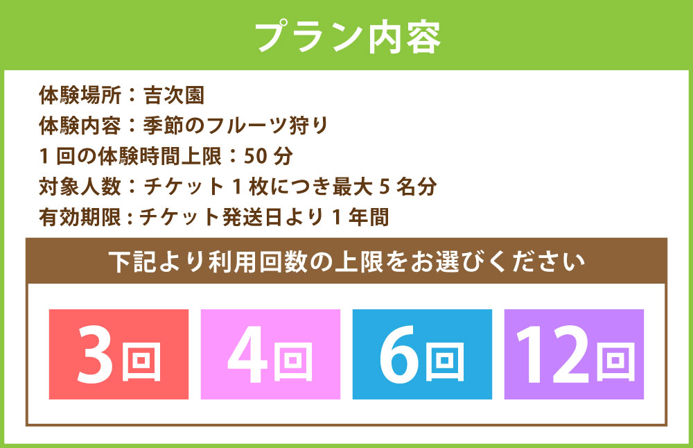 - 【ふるさと納税】<選べる利用回数>観光農園吉次園の「旬を味わうフルーツ狩りパスポート」 3回 / 4回 / 6回 / 12回 季節のフルーツ狩り 1回50分 1枚につき最大5名分 フルーツ くだもの 果物 果実 施設利用券 商品券 チケット 旅行 体験 レジャー 九州 熊本県 送料無料