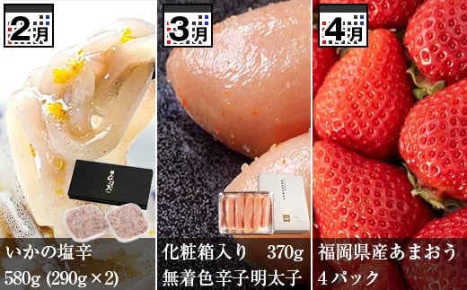 福岡県須恵町よりお届け!須恵うまかもん定期便(3か月) SE011-1 いかの塩辛 辛子明太子 あまおう