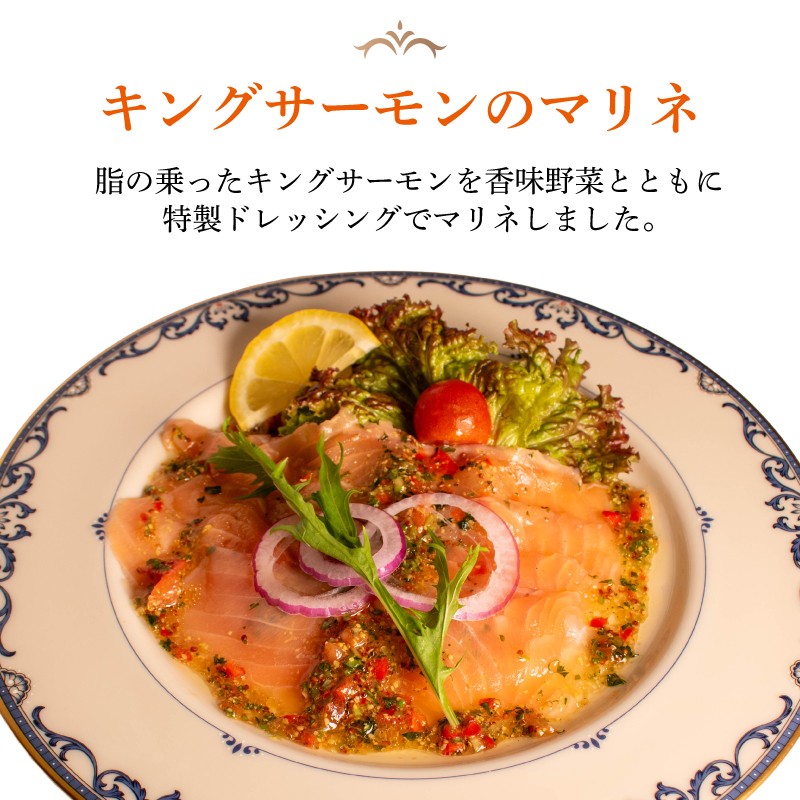 キング サーモン マリネ 3食 入 ノルウェー産 ビストロ 特製 真空パック 特製 惣菜 本格 簡単調理 手軽 フランス料理 ランチ ディナー 夕食 惣菜 簡単 調理 地元 で 人気 ビストロサカイ 地元野菜 魚料理 鮭 さけ サケ キングサーモン 海鮮 おかず プレゼント おつまみ 酒の肴 パーティー料理 オードブル レトルト 石川県 羽咋 能登