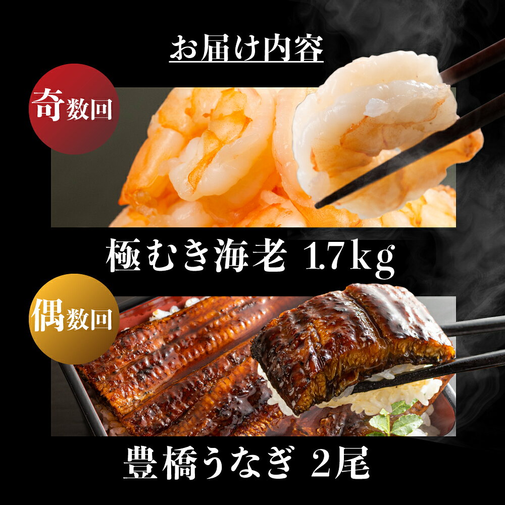 【ふるさと納税】超高評価 海老 & うなぎ 定期便 選べる 2回 4回 6回 12回 半年 一年 大粒 バラ凍結 海鮮 えび 訳あり 鰻 むきえび 大容量 2尾 1.7kg 簡易包装 海鮮 冷凍 最高級 長蒲焼 特大サイズ 楽天限定 土用丑の日 丑の日 簡単調理 惣菜 大容量 豊橋市