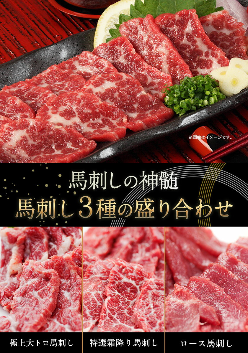 【ふるさと納税】馬刺し3種の盛り合わせ【特選霜降り馬刺し80g/ロース馬刺し80g/赤身馬刺し80g×2】+タレ100ml付き《30日以内に出荷予定(土日祝除く)》
