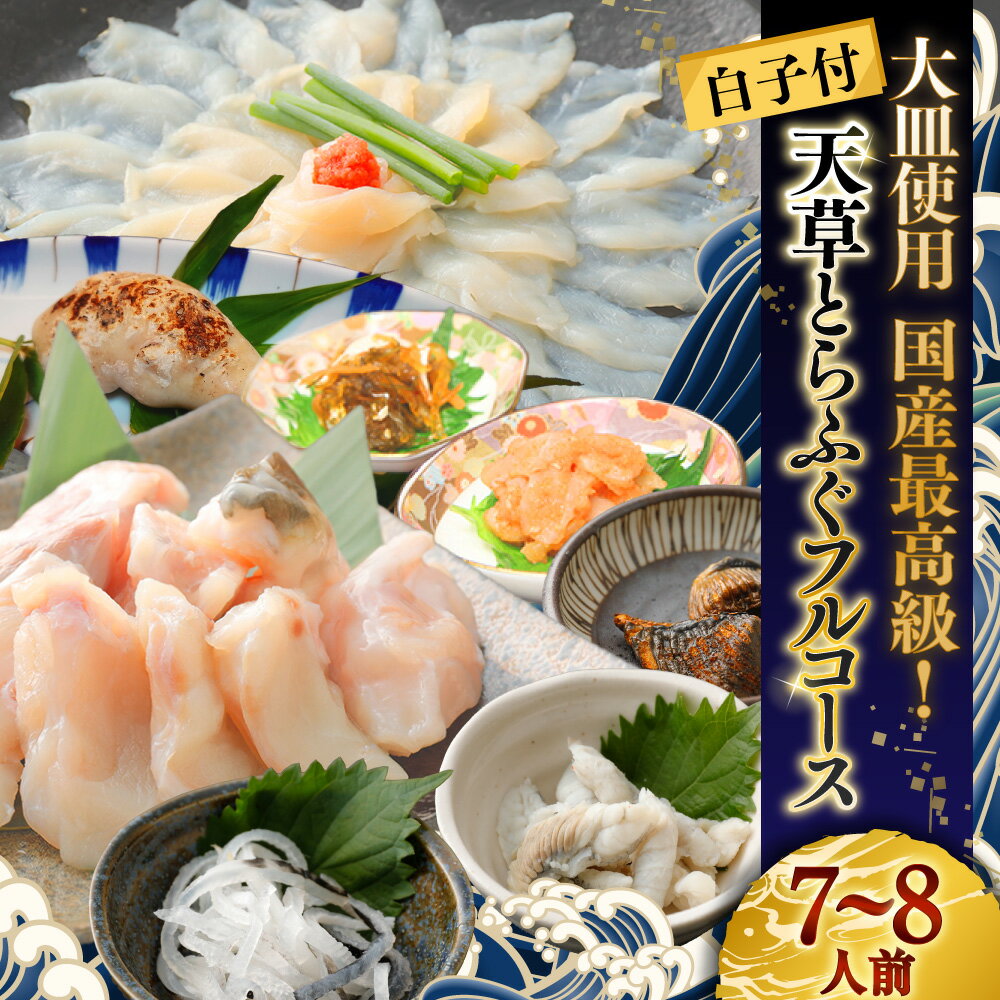 【ふるさと納税】【白子付】大皿使用 国産最高級!天草とらふぐフルコース 7~8人前 とらふぐ トラフグ 刺身 白子 皮 切身 アラ 旨辛明太和え 本皮松前漬け ひれ酒用焼きひれ 魚介類 水産物 詰め合わせ 冷凍 熊本県産 国産 九州 熊本県 送料無料 【2025年12月下旬発送開始】