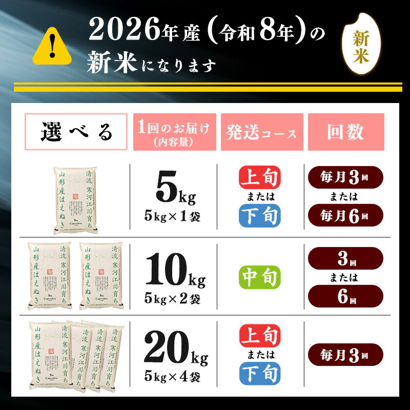 - 【ふるさと納税】新米 先行予約【3回から選べる 定期便】 令和8年産 はえぬき 15kg 〜 60kg 山形県産 2026年産 米 お米 山形産 5キロ 10キロ 15キロ 20キロ 30キロ 60キロ 5kg 10kg 20kg 2袋 4袋 3回 6回 3か月 6か月 6か月小分け 発送時期 配送時期 ブランド米 米30キロ