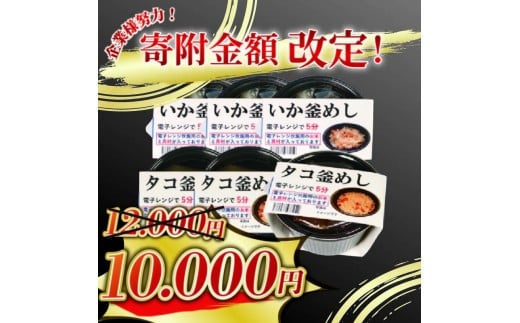 - 釜めし 6個 いか釜めし3個 タコ釜めし3個 電子レンジ 簡単 手軽 加工食品 魚貝類 海産物 海の幸 いか 烏賊 たこ 蛸 長期保存 防災 備蓄 常温 常温保存 テレビ TV 放送 ニュース 番組 大船渡 大船渡市 三陸 岩手県