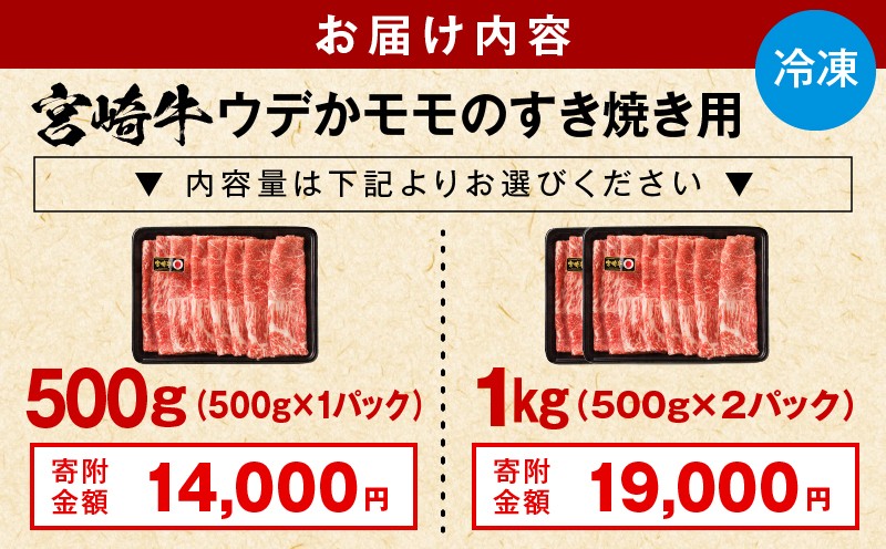 - 【容量が選べる】宮崎牛赤身すき焼き用500g~1kg|すき焼き用 すきやき すき焼き 鍋 鍋料理 肉 牛肉 ウデ モモ ウデ肉 モモ肉 モモスライス ウデスライス 赤身 500g 1kg 小分け パック 薄切り スライス 宮崎県産 国産 国産牛 宮崎牛 黒毛和牛 和牛 ブランド牛 グルメ お取り寄せ 冷凍 贈答 贈り物 ギフト 人気 おすすめ 宮崎県 宮崎市 宮崎|_M132-062-SKU