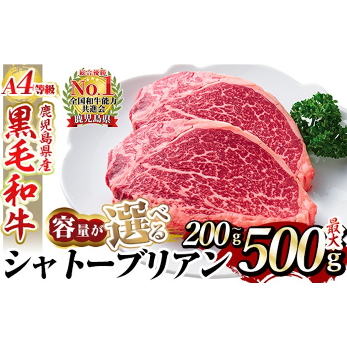 - <選べる容量>A4等級 以上 鹿児島産黒毛和牛・シャトーブリアン(計200g~最大500g)【財宝】国産 牛肉 希少部位 フィレ ステーキ a269 a271 a326 a1076