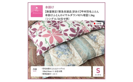 羽毛布団 【数量限定!緊急支援品 訳あり】甲州羽毛ふとん 本掛け布団 ロイヤルダウン93%増量1.3kg(シングル/お任せ柄) 暖色 シングル 寝具 本掛けふとん 羽毛布団 山梨 富士吉田