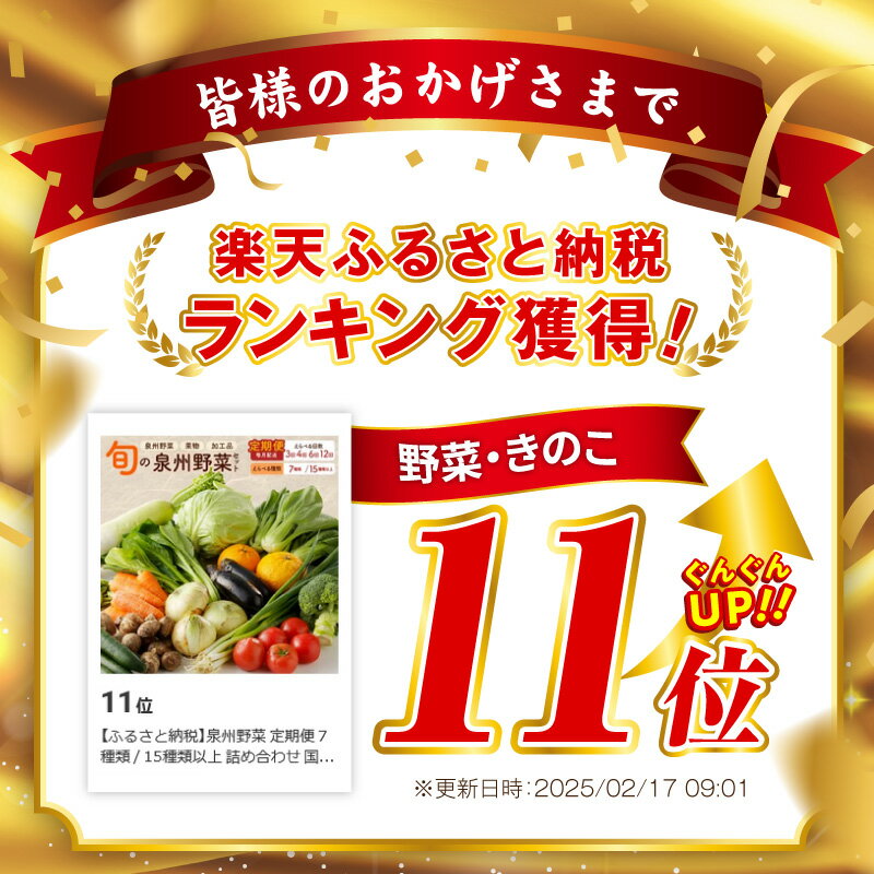 - 【ふるさと納税】泉州野菜 定期便 7種類 / 15種類以上 詰め合わせ 国産 野菜 セット 新鮮 常温 毎月配送コース 地元新鮮野菜 果物 加工品 産直売場 旬 厳選 季節野菜 毎日食材 アローズ 食品 大阪府 泉佐野市 送料無料